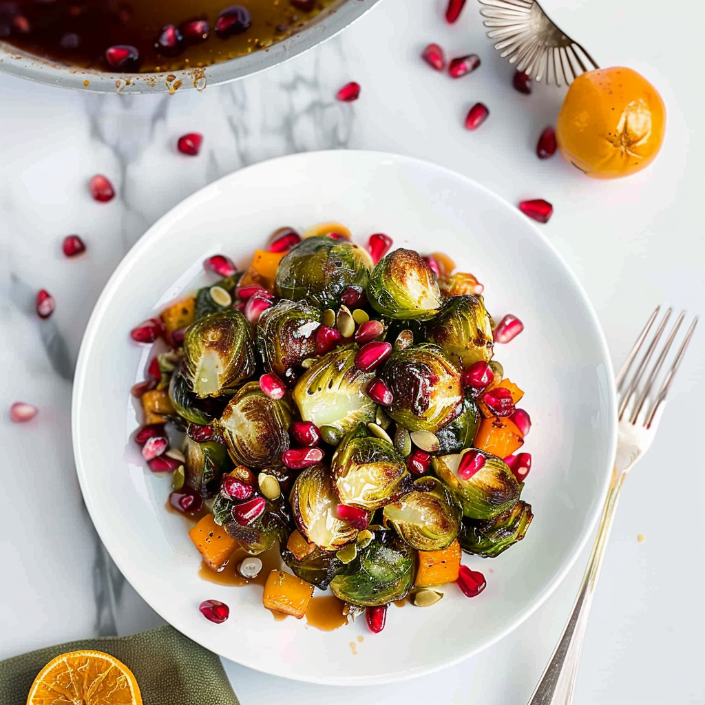 Perfectly Roasted Brussels Sprouts with Pomegranate & Maple