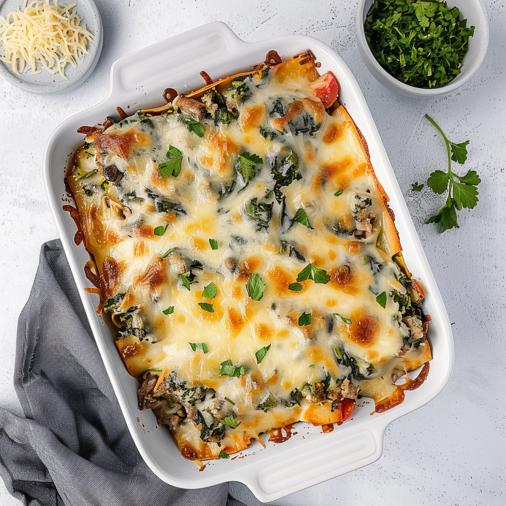 Irresistible Cheesy Tomato Spinach Beef Tortilla Bake