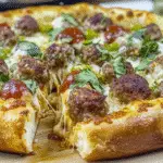 Deep Dish Meatball Pizza is the ultimate comfort food, featuring a buttery, crispy crust that holds juicy meatballs, rich marinara sauce, and gooey mozzarella cheese. Perfect for family gatherings or cozy nights in, this hearty dish promises to satisfy your cravings and impress your guests. With its customizable toppings, it’s an ideal choice for any occasion.