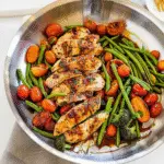 - Bake for 25-30 minutes until chicken reaches an internal temperature of 165°F (74°C) and veggies are tender-crisp.