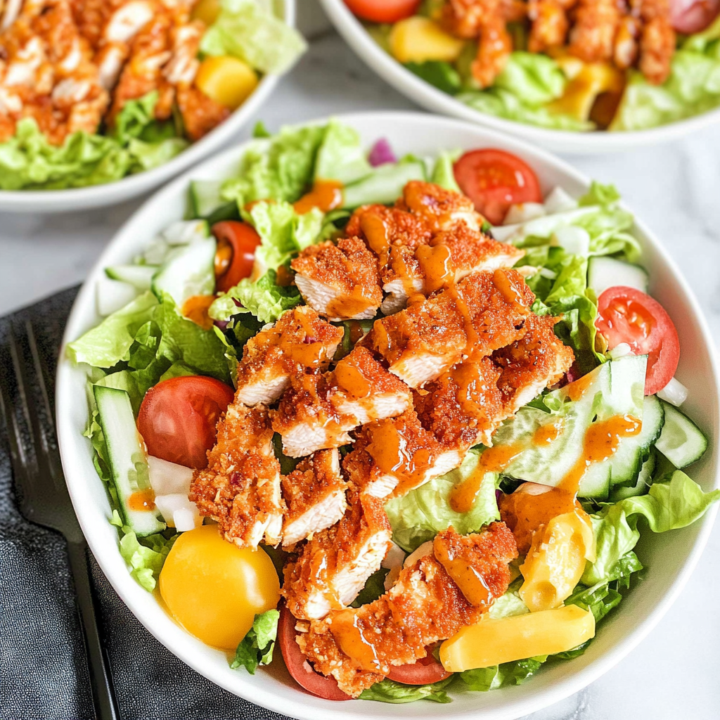 Start by marinating the chicken in a honey hot sauce blend. While it marinates, chop your salad ingredients. Sear the chicken until golden brown, then toss it into the salad for a warm, zesty experience.