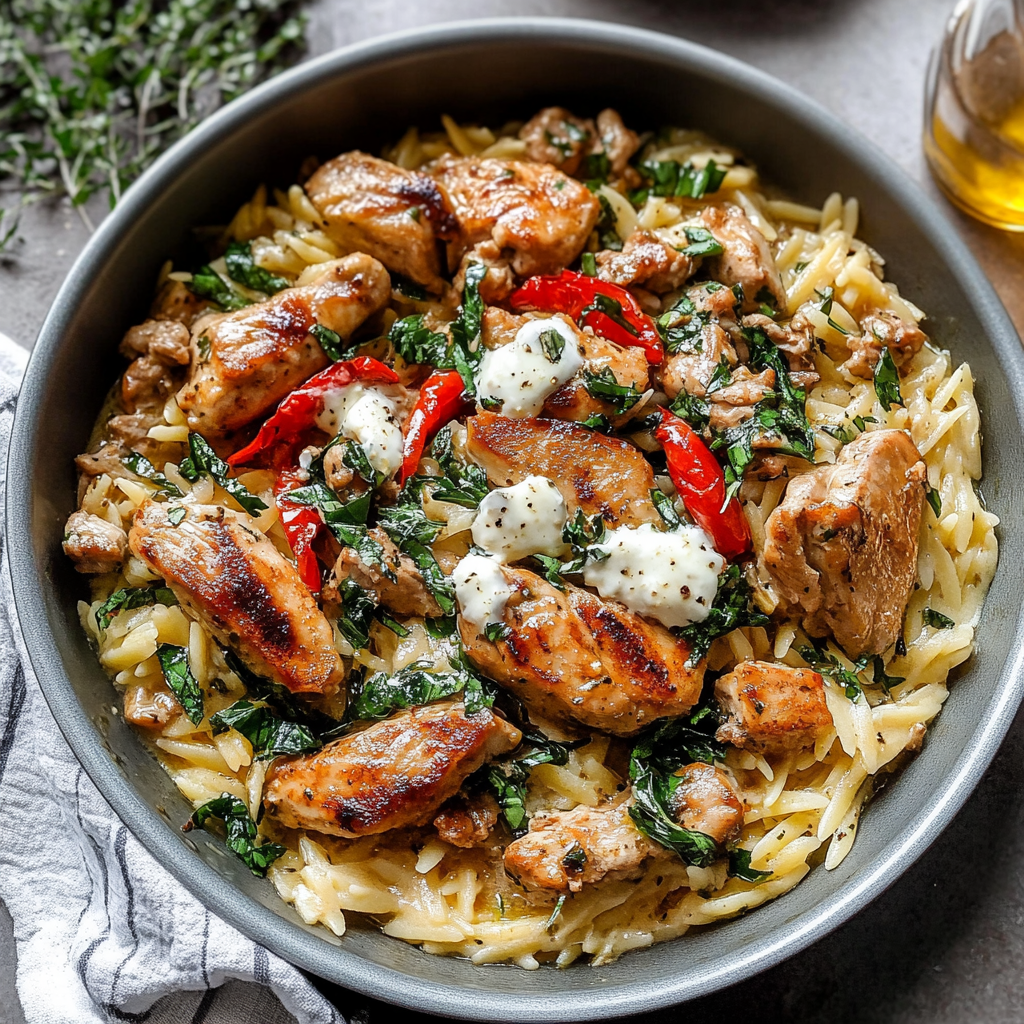 Keywords: - For added flavor, consider marinating the chicken overnight. - Substitute orzo with couscous or quinoa for a different twist. - Add roasted vegetables like zucchini or bell peppers for extra nutrition.