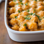 - Bake for 25–30 minutes until tater tots are golden brown and crispy.