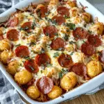 In summary, the Pepperoni Pizza Tater Tot Casserole is an easy and satisfying meal that combines classic flavors into one delightful dish. With simple ingredients and straightforward preparation, it’s perfect for family dinners or casual gatherings. Feel free to customize the recipe based on your taste preferences while keeping in mind cooking times and methods for best results. Enjoy this crowd-pleaser at your next event!