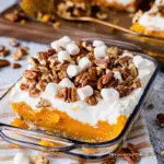 Topping Time: Sprinkle mini marshmallows generously over the top followed by chopped pecans. Get creative here! You want an aesthetically pleasing layer that screams “please eat me!”
