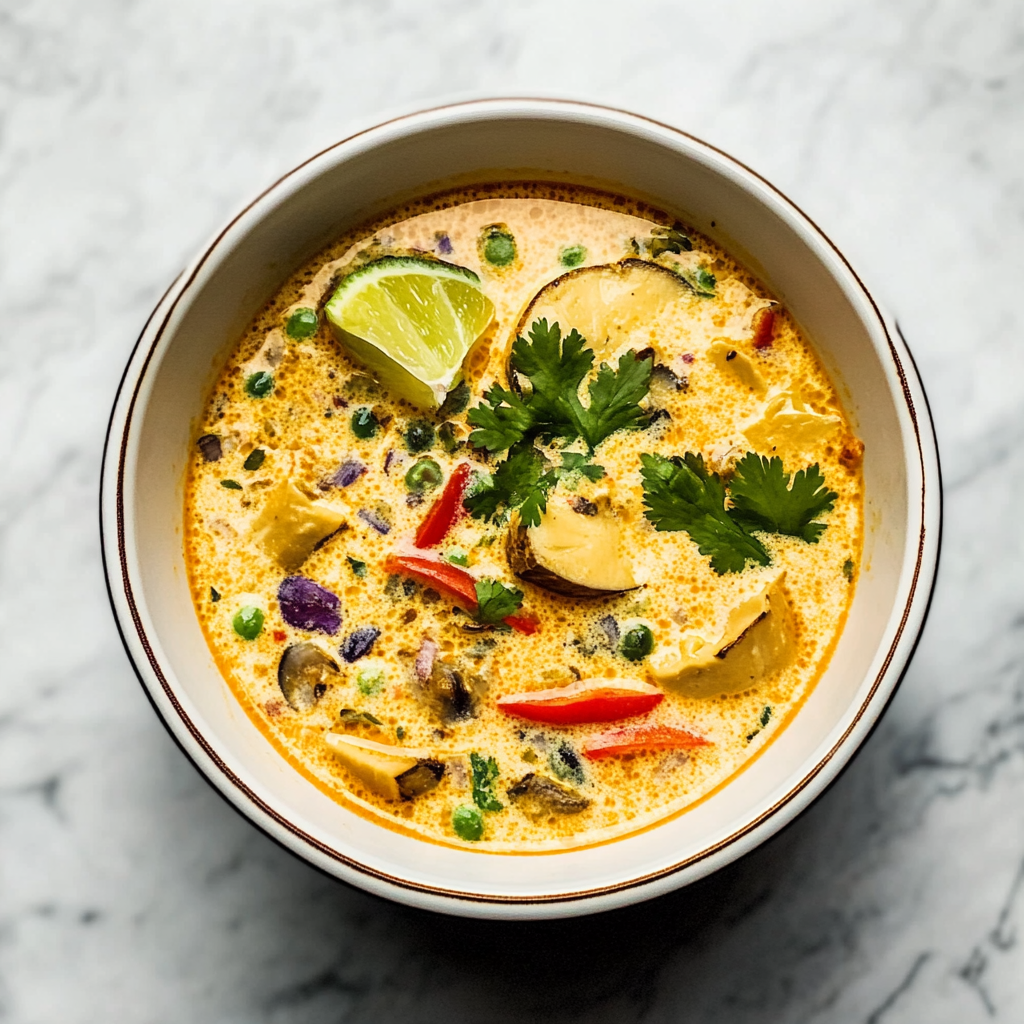 Indulge in the warmth of Thai Coconut Soup, a delightful blend of creamy coconut milk, vibrant spices, and fresh herbs. This comforting dish transports you to a bustling street market in Thailand with every spoonful. Perfect for cozy nights or when you need a warm pick-me-up, this easy-to-make soup is ideal for any occasion.